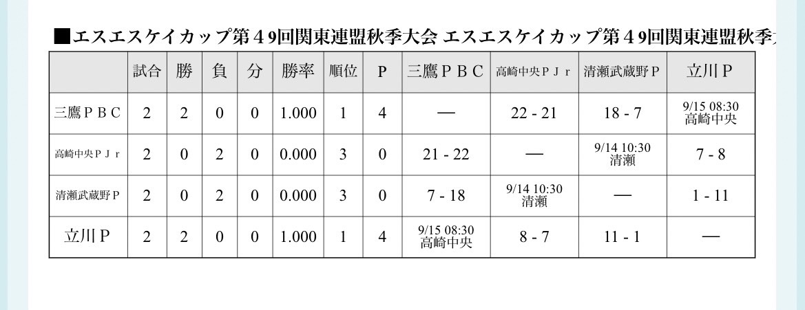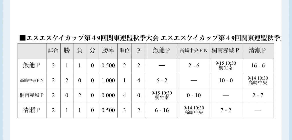 9/14試合結果:武蔵野対高崎中央pjr(3-2)勝利。清瀬P対高崎中央PN(12-8)勝利でした。