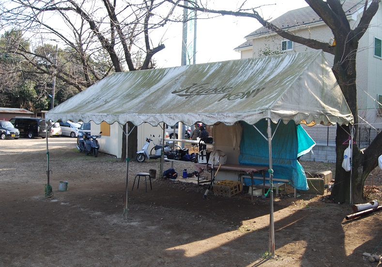 本部テントは2012年ごろまでスタッフ用の簡易テントのみでしたが、食育トレーニングの始まった2013年ころから、その後方に選手用の多目的用として大きなテントが増設されました。そこで選手たちは雨風しのいで食事をし勉強にも大いに励みました。2014年2月8日の大雪で屋根が崩落。その4月には選手・スタッフ一体型の新しいテントが設営されました。
